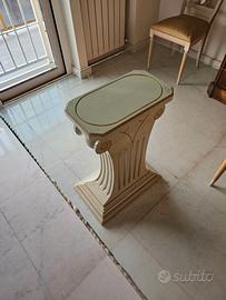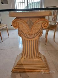 Vendo della Linea mobili Visconti un tavolo di cristallo 90 cm x 180 cm in ottimo stato. Il tavolo è sostenuto da due basi a forma di capitelli in legno che sono intarsiati e colorati a mano. Il tavolo è completo di 6 sedie color oro con schienale a forma di strumento musicale Lira andrebbero rifoderate.