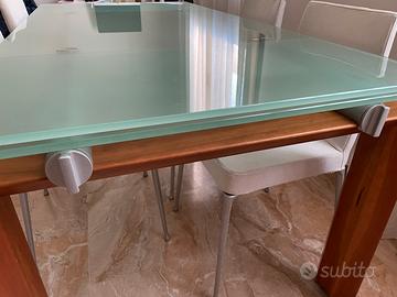 Tavolo allungabile rettangolare in acciaio e cristallo. Gambe in massello di legno. Stilt by Desalto.
