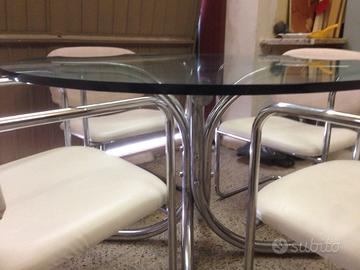 Tavolo rotondo di design anni '70 in cristallo e acciaio, corredato da sei sedie in acciaio. Diametro tavolo cm 120. Tavolo in ottime condizioni. Sedie con cuscini da rifoderare.