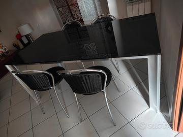 Vendo tavolo cristallo temperato nero e acciao lungo 1.80 allungabile 2.40 con allungo in acciao, completo di 4 sedie con seduta in pelle nera marchio Ciacci