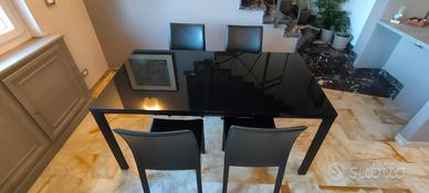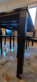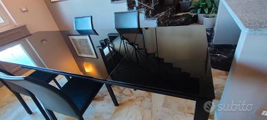 Tavolo rettangolare di pregio con piano in cristallo nero lucido e struttura portante in metallo color nero.