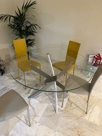 Tavolo Riflessi tondo 130 cm, piano in cristallo, gambe in metallo Shangai. Buone condizioni, si segnala solo distacco di uno degli attacchi delle gambe (da re incollare)