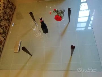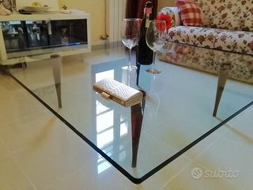 Tavolino da salotto di cristallo trasparente con piedi in legno. Forma quadrata, 130 x 130 cm; spessore del cristallo 1,5 cm; altezza da terra 35 cm. Perfetto, nessun graffio, come nuovo, acquistato da Sanna Arredi a Sassari.