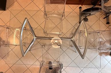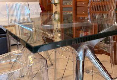 Tavolo con piano in cristallo e base in metallo realizzato artigianalmente da mobiliere su modello Scab. Possibilità di acquistare anche 4 sedie Scab modello Glenda a 200€. Design moderno e minimalista.