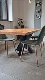 Elegante, scultoreo, tavolo con struttura a crociera per poter inserire le sedie senza interferenze sotto il tavolo. Molto comodo anche per le gambe delle persone sedute a tavola in quanto non trovano le classiche gambe del tavolo.