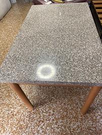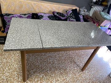 Tavolo allungabile con top in laminato da 3 cm di spessore, effetto marmo. Altezza 77, chiuso 80 X 129. Aperto 80 X 170. Nessun bozzo o graffio, il tavolo è stabile e robusto.