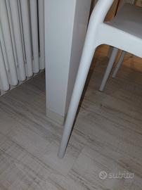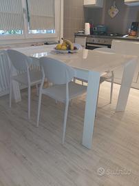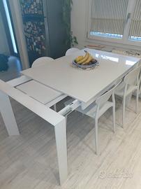 Tavolo cucina bianco con piano in vetro, allungabile. Misure: 140X100X78 su una gamba del tavolo, sul piede ce una scheggiatura. piu foto su richiesta