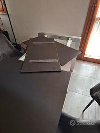 Tavolo cucina pranzo allungabile, bella struttura in alluminio con piano sottile marrone, completo di 2 prolunghe riponibili a scomparsa + 4 sedie in velluto grigio westing. Possibilità anche di vendita separata tavolo sedie