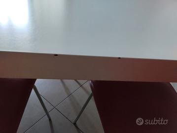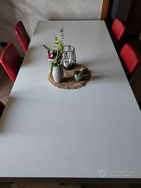 Cedo tavolo da soggiorno bianco per cessato utilizzo. Dimensioni: lunghezza 209 cm, larghezza 95cm, altezza 77 cm. Presenta dei punti in cui è saltato lo smalto, tutti sui profili laterali (allegate foto). Il piano del tavolo presenta dei segni e graffi visibili per lo più in controluce. Lo stato del prodotto è buono e la struttura è in ottime condizioni. Il prezzo di questo annuncio è compreso delle sedie rosse in ecopelle. Tutte e 6 le sedie sono in buone condizioni. Non presentano particolari difetti. Nel caso interessasse solo il tavolo disponibile a cedere anche il solo tavolo. Ritiro presso mia abitazione.