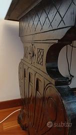 Vendo d'epoca tavolo con 4 sedie stile zampe di leone e intarsi. Sedie con seduta e schienale in pelle originale. Tavolo con 2 cassetti, dimensioni 75x150x80.