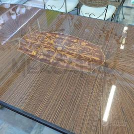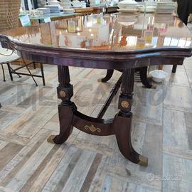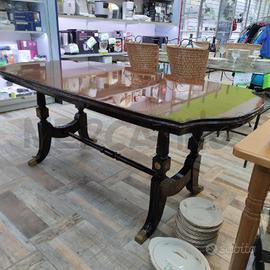 TAVOLO D EPOCA LEGNO VINTAGE CON FREGIO DORATO AL CENTRO IN RADICA LACCATO E PARTICOLARI IN OTTONE SU ZAMPE E GAMBE ALTEZZA 80 CM DIMENSIONI PIANO 80 X 190 /
