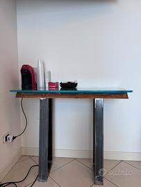 Tavolo alto da utilizare come angolo caffè/te; in legno con vetro sopra e gambe di ferro.