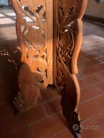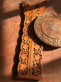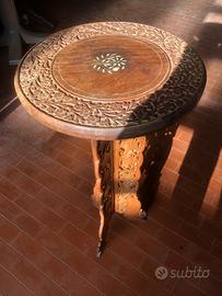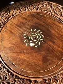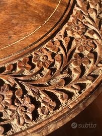 Il tavolino nell'immagine è un tavolino in legno intagliato a mano di origine indiana con decorazioni intricate sia sul piano che sulle gambe.
