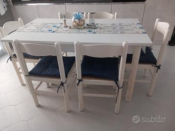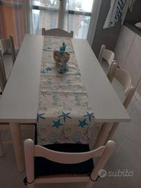 Tavolo allungabile bianco, con sedie coordinate. Misure 140×90. Più prolunga. Il tutto in buone condizioni. Visibile al lido delle nazioni.