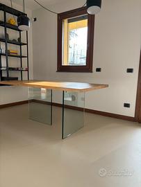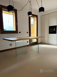Tavolo fatto realizzaere da falegname su modello Air della Lago. Gambe in vetro e piano in legno massello( pezzo unico). Dimensioni 180x90. Compresa allunga da 40cm . Il tavolo ha due giorni di vita. Quando è stato montato ci siamo resi conto che e’ piccolo per la ns cucina .