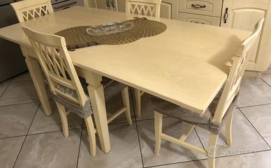 Vendesi tavolo da cucina 90x90 chiuso, 90x180 aperto, sedie non incluse, leggermente rovinato al centro come visibile in foto. No spedizione
