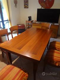 Splendido tavolo in vero legno di ciliegio, con sedie dello stesso colore e materiale, con seduta imbottita. Il tavolo ha 2 prolunghe sui lati stretti. Dimensioni tavolo chiuso: cm 170 x 90 h80. Trasporto a carico dell'acquirente.