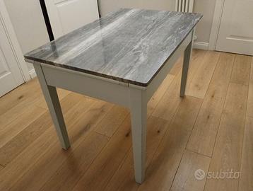 Tavolo da cucina anni '60 con struttura in legno, piano in marmo scuro e 2 cassetti frontali.