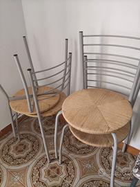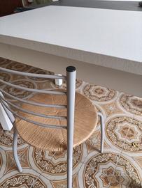 Tavolo da cucina allungabile con 6 sedie ancora in buono stato. Gambe in ferro e top il legno. Sedie in ferro con seduta tipo vimini.(vedi foto) Tavolo colore bianco e sedie grigio e marrone chiaro.