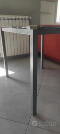 tavolo da cucina con struttura in ferro (colore grigio) e ripiano in vetro temperato di colore grigio. Attualmente presenti paraspigoli di gommapiuma facilmente riuovibili