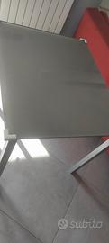 tavolo da cucina con struttura in ferro (colore grigio) e ripiano in vetro temperato di colore grigio. Attualmente presenti paraspigoli di gommapiuma facilmente riuovibili