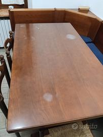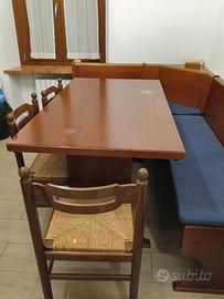 Vendo tavolo da cucina / sala da pranzo in legno con panca ad angolo e 3 sedie coordinate con seduta in paglia intrecciata.Caratteristiche: