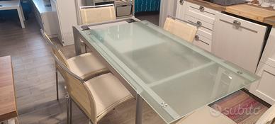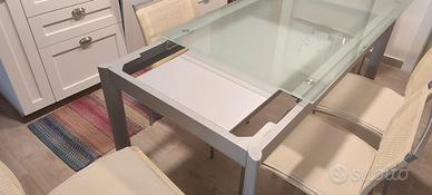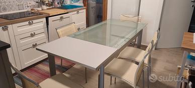 Vendo tavolo da cucina in vetro dimensioni 80cm x 140 cm + prolunga in legno da 48 cm. I piedi sono in metallo verniciato.