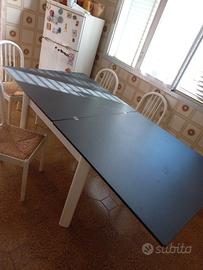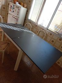Vendo tavolo da cucina quadrato più quattro sedie. Con qualche piccola imperfezioni su tavolo vedi foto. Misure del tavolo aperto 2 metri per un metro. Chiuso il tavolo quadrato un metro per un metro. Anche le sedie hanno delle imperfezioni. Trasporto e smontaggio a carico dell'acquirente. No spedizione.