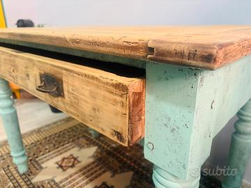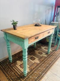 Tavolo da campagna stile Farmhouse anni 40/50 in legno massiccio con finiture azzurro/turchese cassetto e maniglie in ottone Misure 110x67 h80