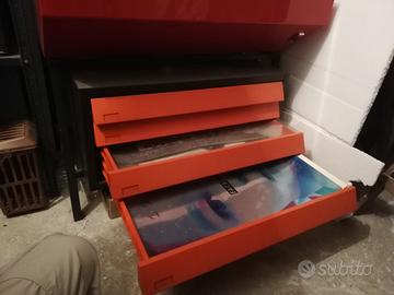 Struttura e cassetti in ferro verniciato, cassa con neon in plexiglass.