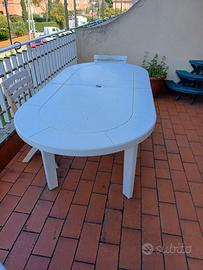 Tavolo da esterni bianco, come da foto. Piano in metallo rivestito in materiale plastico. Estendibile. Gambe in plastica, all'occorrenza separabili, collegate alla parte superiore con tiranti metallici (questi potrebbero essere da sostituire nel caso si vogliano separare le gambe dal tavolo).