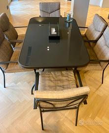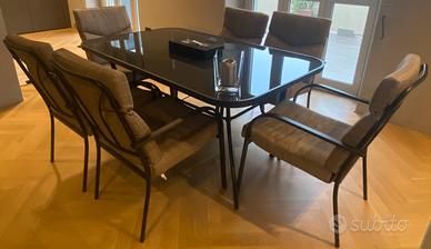 Vendo tavolo da esterno tenuto perfettamente (vero affare) sempre al coperto e mai esposto all’esterno. Tavolo in alluminio e vetro (temperato , può essere esposto all’esterno). Compreso nel prezzo le 6 poltrone comodissime ed impeccabili. Funzionale, elegante e senza nessun difetto. Foro centrale per ombrellone. Comprato 2 anni fa a 900 euro. Tavolo semplice da smontare per favorire un facile trasporto con imballaggio del top in vetro per evitare danni, comunque struttura abbastanza leggera e agile da movimentare.