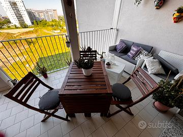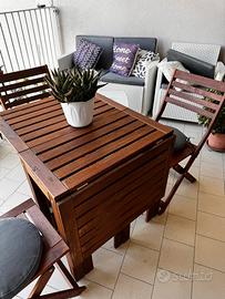 Vendo tavolo ikea da esterno compensivo di 4 sedie e relativi cuscini. Il tavolo ha 3 modalita di apertura.