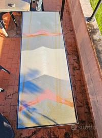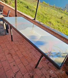 Vendo per inutilizzo splendido tavolo da esterno/giardino in ferro fatto a mano con elegante piano di cristallo. Il tavolo è stato comprato due anni fa, tenuto al coperto sotto una tettoia, nuovo e mai usato. Il piano di cristallo ha delle eleganti forme colorate all'interno di esso, che gli donano un aspetto elegante e raffinato. Dimensioni: 210cm lunghezza, 78cm larghezza, 78 altezza. Prezzo trattabile. Preferibile ritiro a mano.