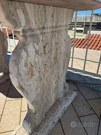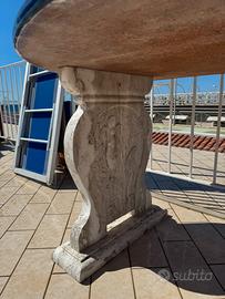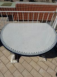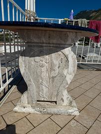 Vendo elegante tavolo da esterno con base in marmo scolpito e piano in ceramica decorata con motivo floreale blu.