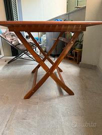 Vendo tavolo da esterno in legno con foro centrale per ombrellone. Lungo e largo 120x70 cm e alto 75 cm. Il tavolo è richiudibile.