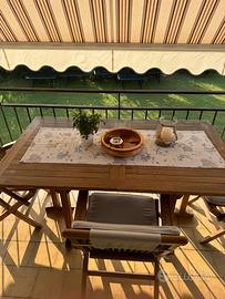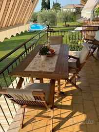 Vendo tavolo da giardino allungabile in teak (miglior legno per esterno) con 6 poltrone complete di cuscinatura su seduta e schienale.