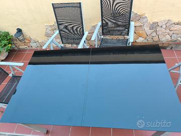 tavolo da giardino/esterno con struttura in alluminio e piano in vetro nero. lunghezza 150cm. 90cm. larghezza, ottimo per 6 persone. perfette condizioni uso.