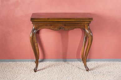 Tavolo da gioco in legno con piano rivestito in panno verde, dotato di quattro incavi angolari per fiches o accessori, ideale per carte, poker o altri giochi da tavolo. La struttura è caratterizzata da eleganti gambe sagomate e da una fascia frontale finemente lavorata che valorizza lo stile classico del mobile. Compatto ma funzionale, è perfetto per salotto, taverna o sala hobby, aggiungendo un elemento di intrattenimento raffinato e decorativo all’ambiente.