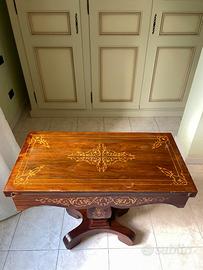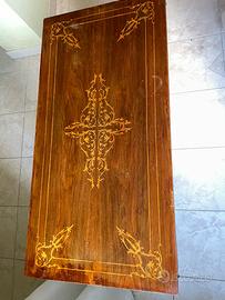 Quando è chiuso, si presenta come un raffinato tavolino rettangolare con un'elaborata decorazione intarsiata in stile classico sulla superficie. Le intricate incisioni dorate aggiungono un tocco di pregio e artigianalità, rendendolo un pezzo d'arredamento distintivo.