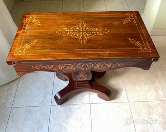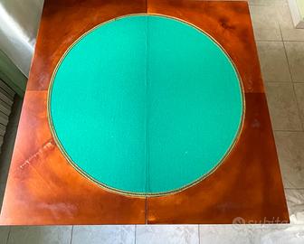 La sua caratteristica principale è la sua funzione apribile: le due ante superiori si aprono e si ripiegano, rivelando un piano di gioco circolare rivestito in panno verde (feltro). Il panno è ideale per giocare a carte, a scacchi o a dama, garantendo una superficie morbida e stabile. La base del tavolo è solida e presenta un design scolpito che ne accentua il carattere classico.