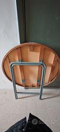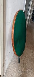 Tavolo da gioco rotondo pieghevole, realizzato in legno con una struttura in metallo e rivestito in panno verde. Buone condizioni. Leggero alone in un punto
