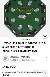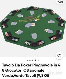 Tavolo da gioco poker con portafiches e portabicchiere. In resistente e solido materiale composito foderato da un pannno verde gradevole al tatto. 8 posti. Pieghevole per un più facile trasporto o riposto.Nuovo, Nuovo, mai usato.