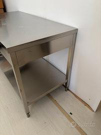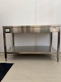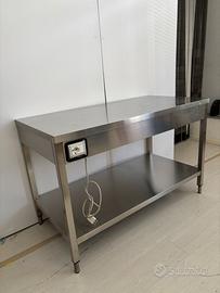Tavolo da lavoro in acciaio inox di 1,2 mm di spessore . Misura 140 cm di lunghezza e 70 cm di profondità per una altezza di 90 cm. Caratterizzato da una robusta struttura, presenta gambe in tubo quadro, piedini regolabili, ripiano, presa di corrente incorporata.