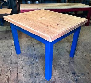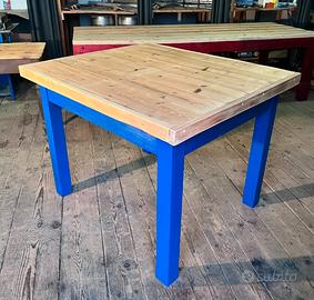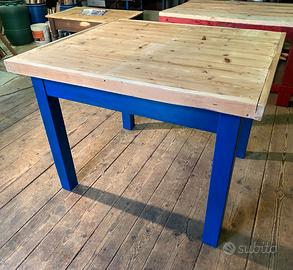 Tavolo da lavoro in legno restaurato e molto solido. Il piano superiore è trattato con finitura trasparente mentre la parte inferiore è stata verniciata con smalto all'acqua di colore Blu Zaffiro. Misure: 120x105x92 cm Ritiro presso Turbigo Stefano