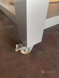 Tavolo in acciaio INOX con ruote dotate di freno, con ulteriore ripiano inferiore, ideale per cucine e ambienti di lavoro.