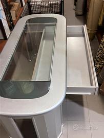 Tavolo con cassetto espositore in legno e vetro. Lunghezza cm 192 x 0.82 alto cm 0.85. Qualche graffio.