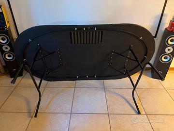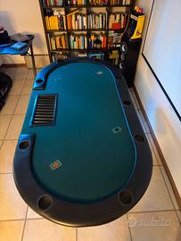 Come da foto vendo tavolo da Poker con gambe pieghevoli. Presenta 3 cup sbeccati e uno mancante da me aoatituito con cup similare. La pelle risulta staccata nella parte bassa del tavolo ma può essere sistemata. Misure: Lungo 208 cm Largo 107 cm Alto 77 cm