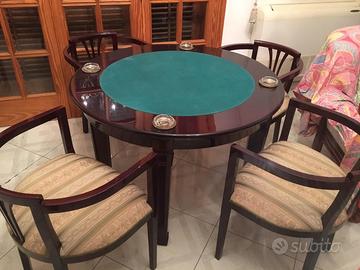 Tavolo da poker con tappeto verde, posaceneri in ottone e cassetto per le carte completo di n.4 sedie-poltrone. Tutto in radica di noce.