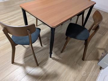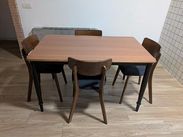 Vendo tavolo rettangolare in legno con gambe nere tornite, abbinato a 4 sedie in legno massello con seduta imbottita in tessuto grigio scuro.